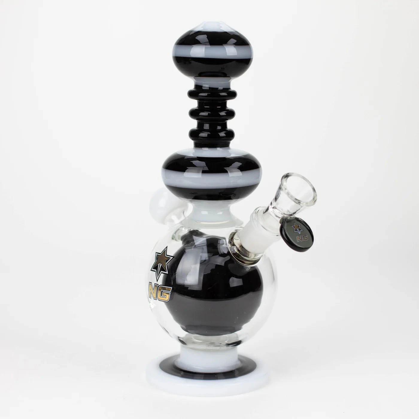 This fun design features a large ball percolator with four filtration holes on the lower half inside a spherical body chamber. This double wall construction disperses the smoke evenly with added surface area to cool it down. The neck tube consists of multiple round air chambers with a small mouth opening.